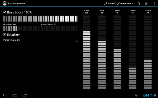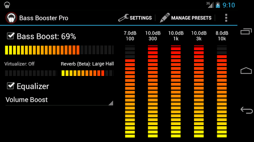20 Presets (More Basses, Improve quality, Electro, Techno, Dubstep, Dance, Pop, Rock, Metal, Reggae, Rap, R&B, Hip-Hop, Jazz, Latino, Acoustic, Classical, Party, Voice Boost, Volume Boost)